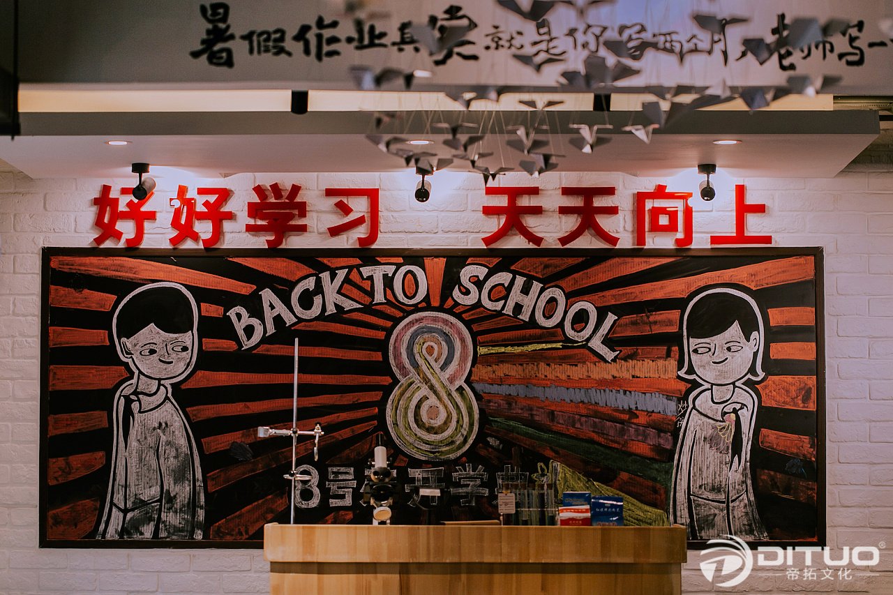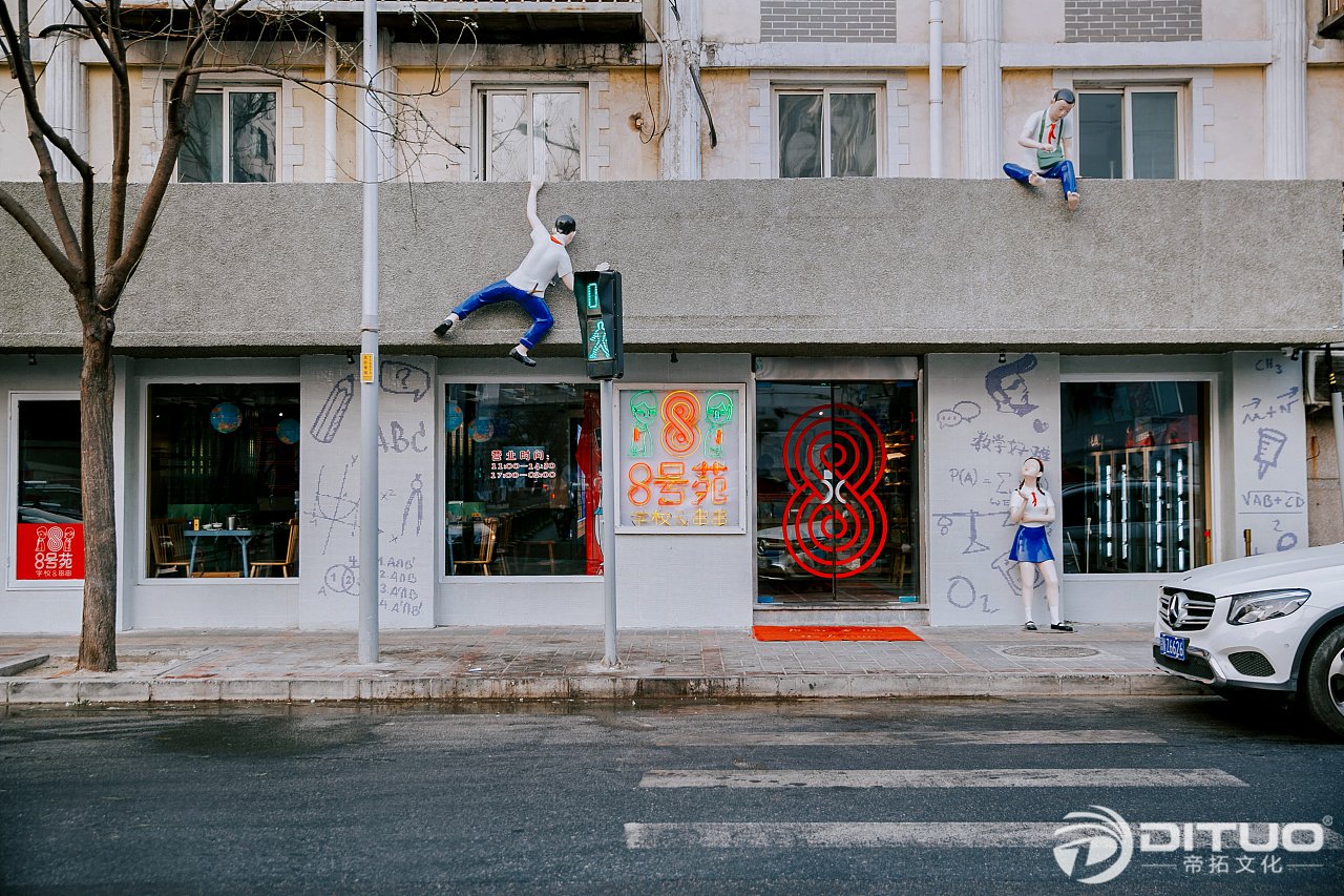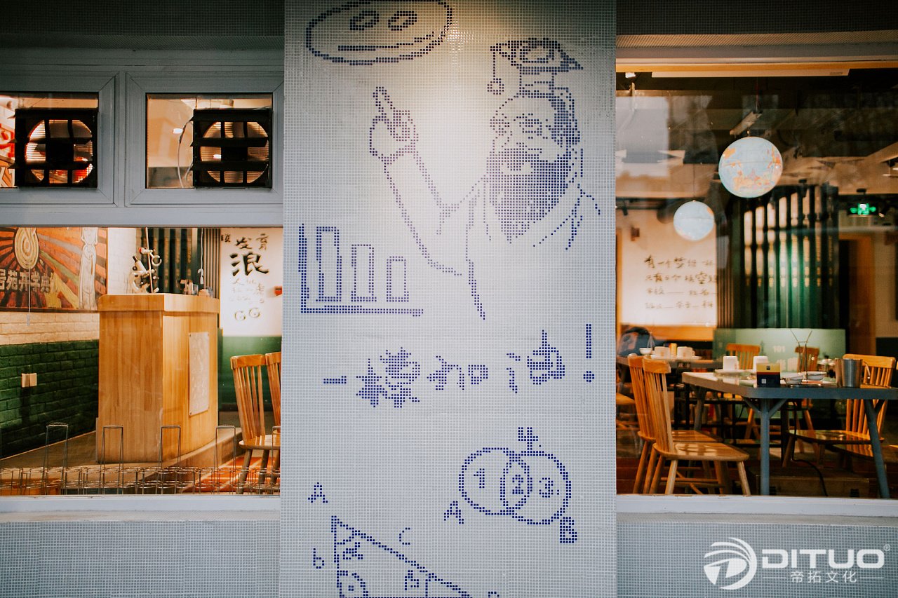 为了能让8号苑的形象鲜明,我们采用了以人物形象传递品牌形象的手法,并且将两个小学生的形象反复的应用在空间之中。事实证明,装修期间的8号苑就有很多路人驻足,开业第一天营业情况相当火爆。