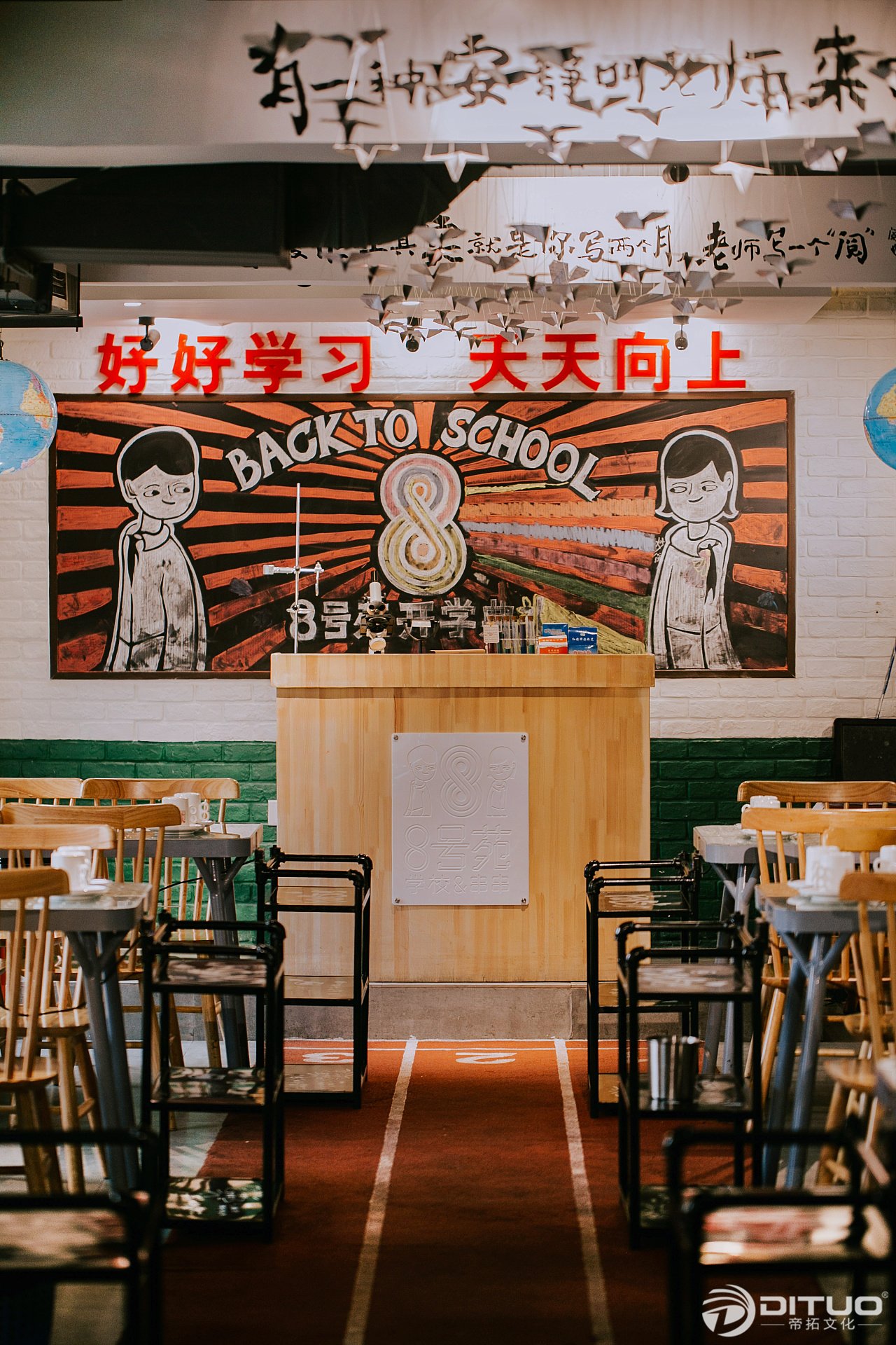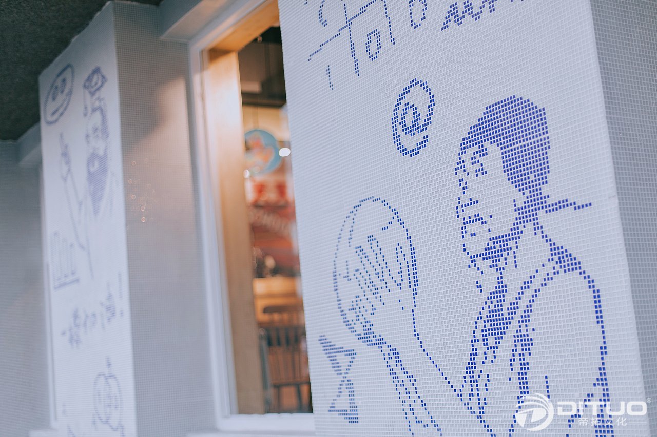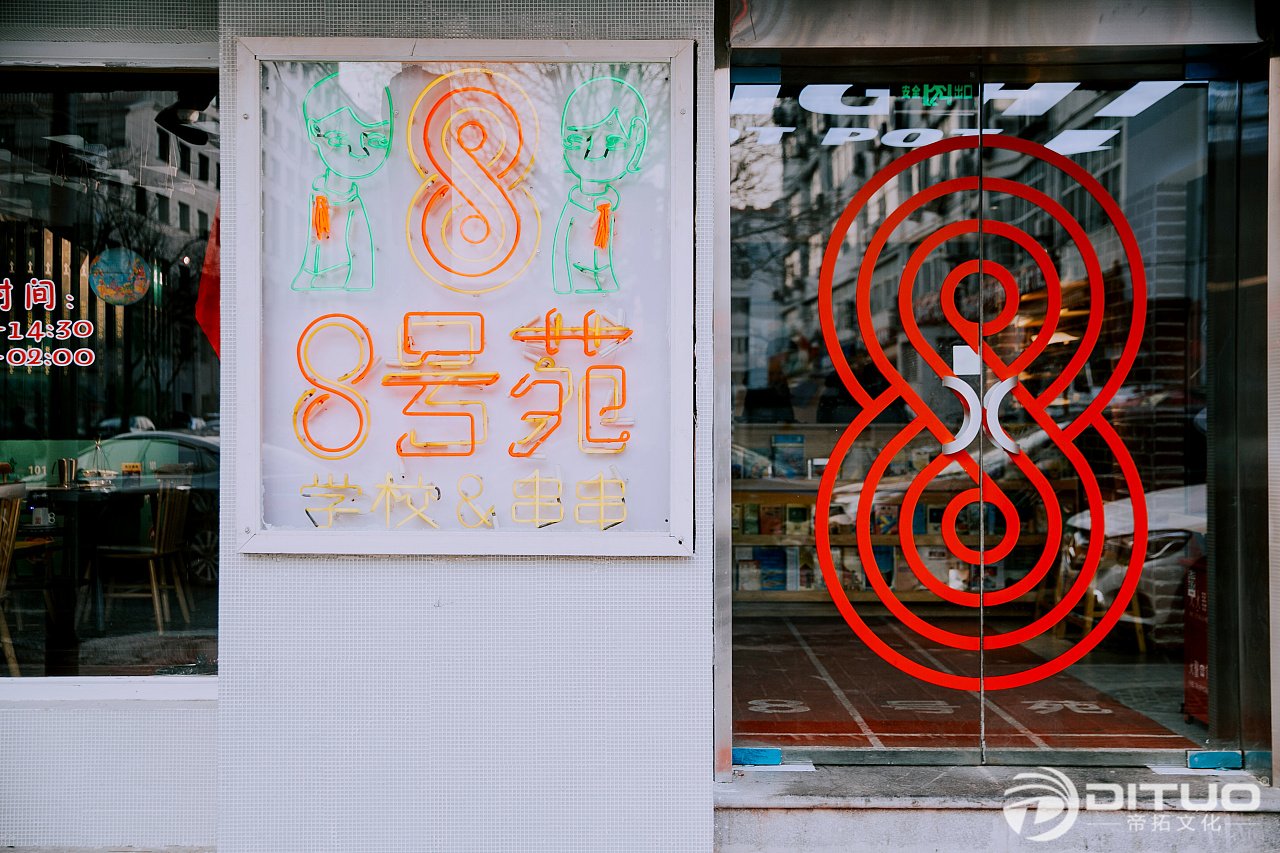 为了能让8号苑的形象鲜明,我们采用了以人物形象传递品牌形象的手法,并且将两个小学生的形象反复的应用在空间之中。事实证明,装修期间的8号苑就有很多路人驻足,开业第一天营业情况相当火爆。